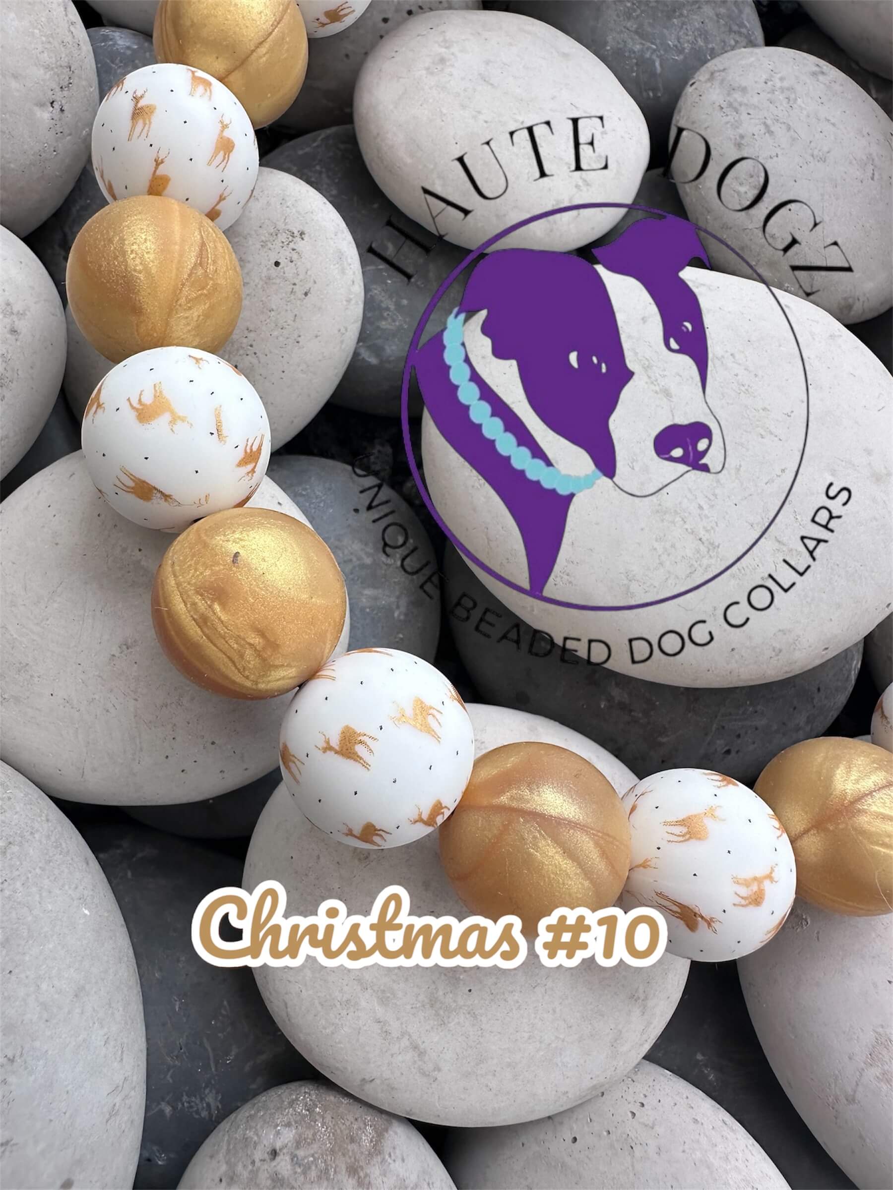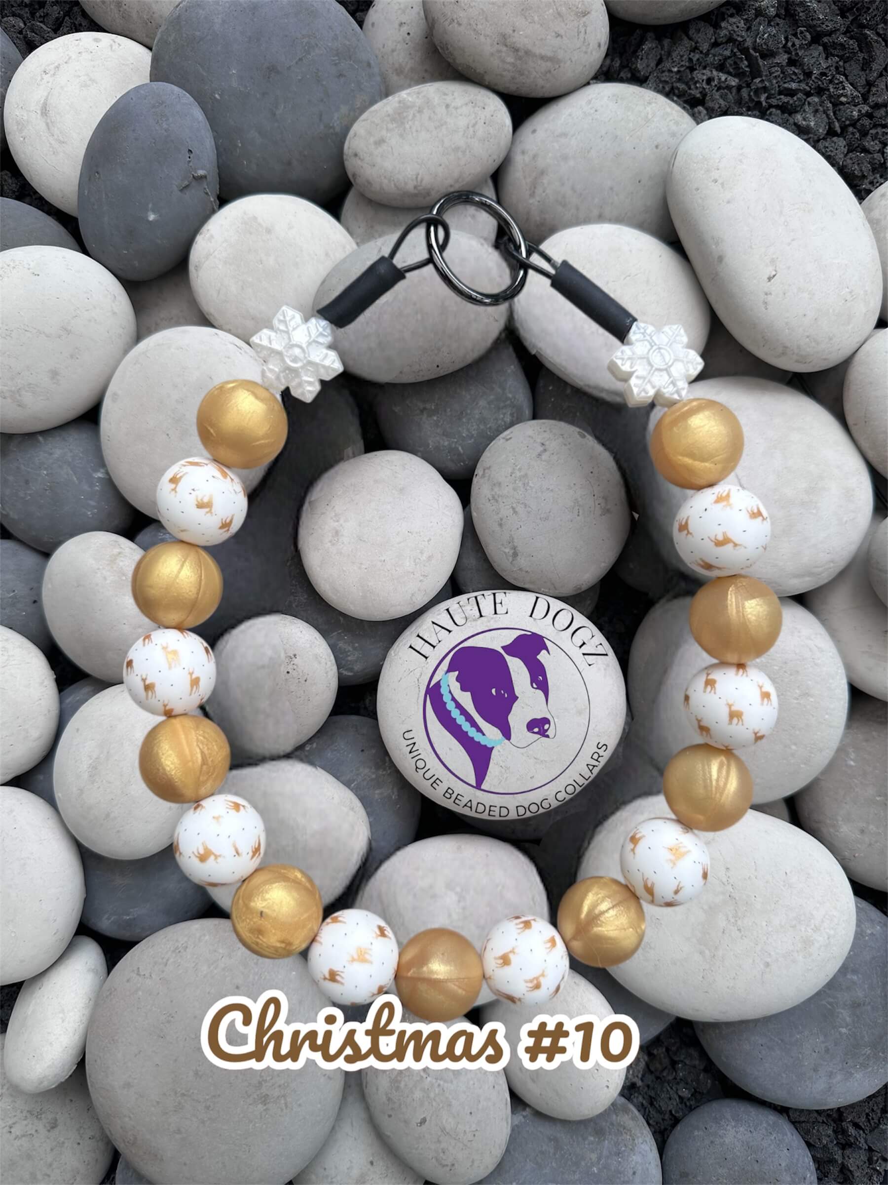 Mixed with champagne gold silicone pearls and ends off with a pearlized snowflake.